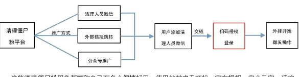 這些所謂的清理僵尸粉工具和技術(shù),實(shí)際上是利用了微信PC或網(wǎng)頁端登錄授權(quán)和外掛軟件進(jìn)行的操作。他們先通過添加清理人員微信、外部鏈接跳轉(zhuǎn)、公眾號推廣這三種方式宣傳,引誘用戶使用。